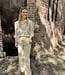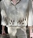 Blouse Model mo658. Leuke beige blouse met details. De blouse heeft een driekwart pofmouw en opengewerkte details aan de onderkant en bovenkant van de blouse. Materiaal: 60% raylon. 30% nylon en 10% lin.