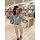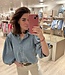 Mitch blouse JS-1167. De blouse is van een denim stof en heeft wijde 3/4 pofmouwen. De lengte is 61 cm en de breedte is 54 cm. Gemeten bij een maat M. Materiaal is 80% katoen en 20% polyester.
